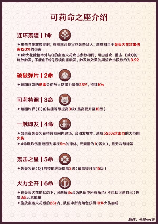 可莉是以站场持续伤害为主的火系输出角色(主C),具有很强的挂火能力与压制力,在部分场合也不乏爆发能力。