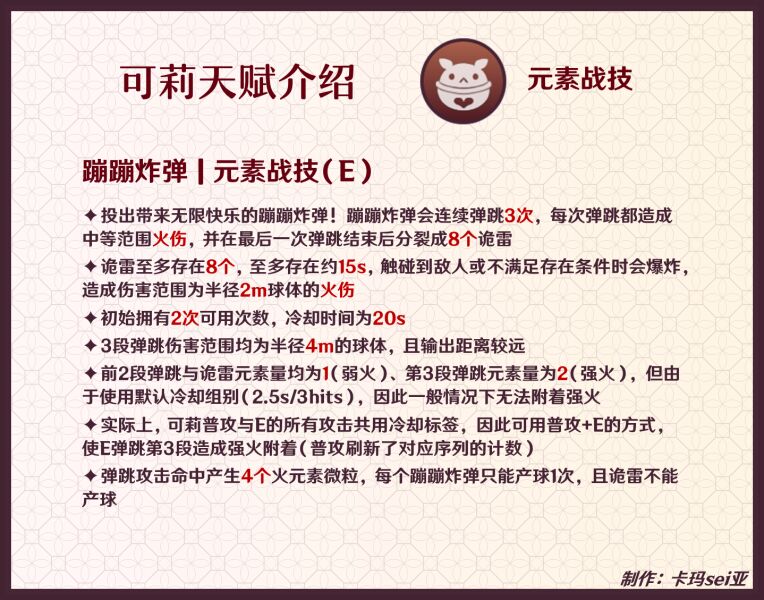 可莉的E总倍率较高,在能吃满的情况下爆发力很强,是纯火流的主要爆发来源,循环输出占比不如A和Q但重要性也不低,升级优先级仅次于A。不过在蒸发流中,E的升级优先级相对更低。