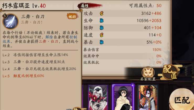 效果:在每个行动(不论敌我)结束时,若自身生命比例降低至60%(满级后60%)以下时,解除自身所有控制效果,并使自身获得三舞白刀,直到战斗结束。