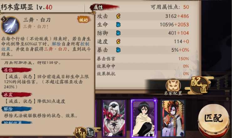 三舞白刀BUFF:永久提升20点(满级30点)速度,攻击时无视15%(满级20%)总效果抵抗并附加冻伤,持续1回合。若目标未带有冰冻,有100%基础概率将其附加冰震,持续1回合
