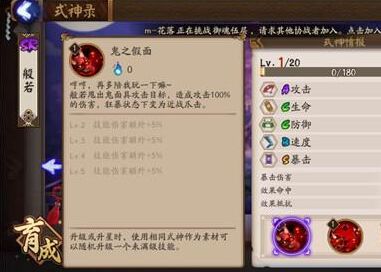 般若召唤巨大的鬼面砸向敌方全体造成攻击的110%伤害,并使自身进入狂暴姿态,狂暴姿态下[鬼之假面]变为2段近战爪击持续2回合。