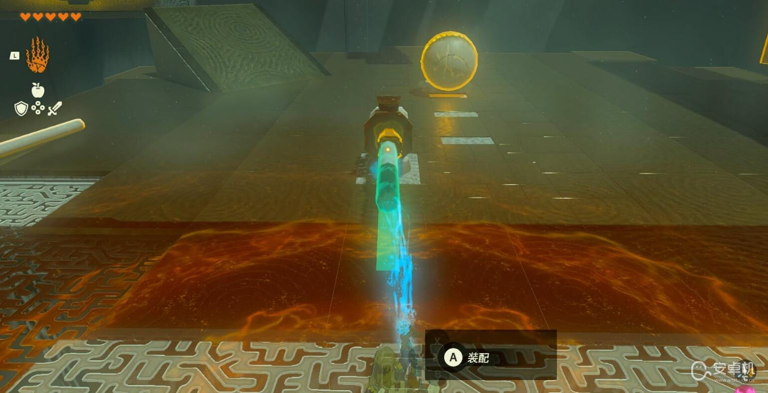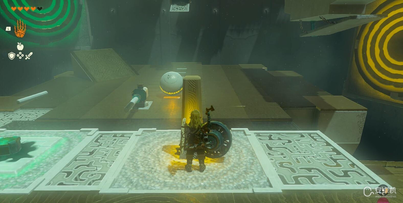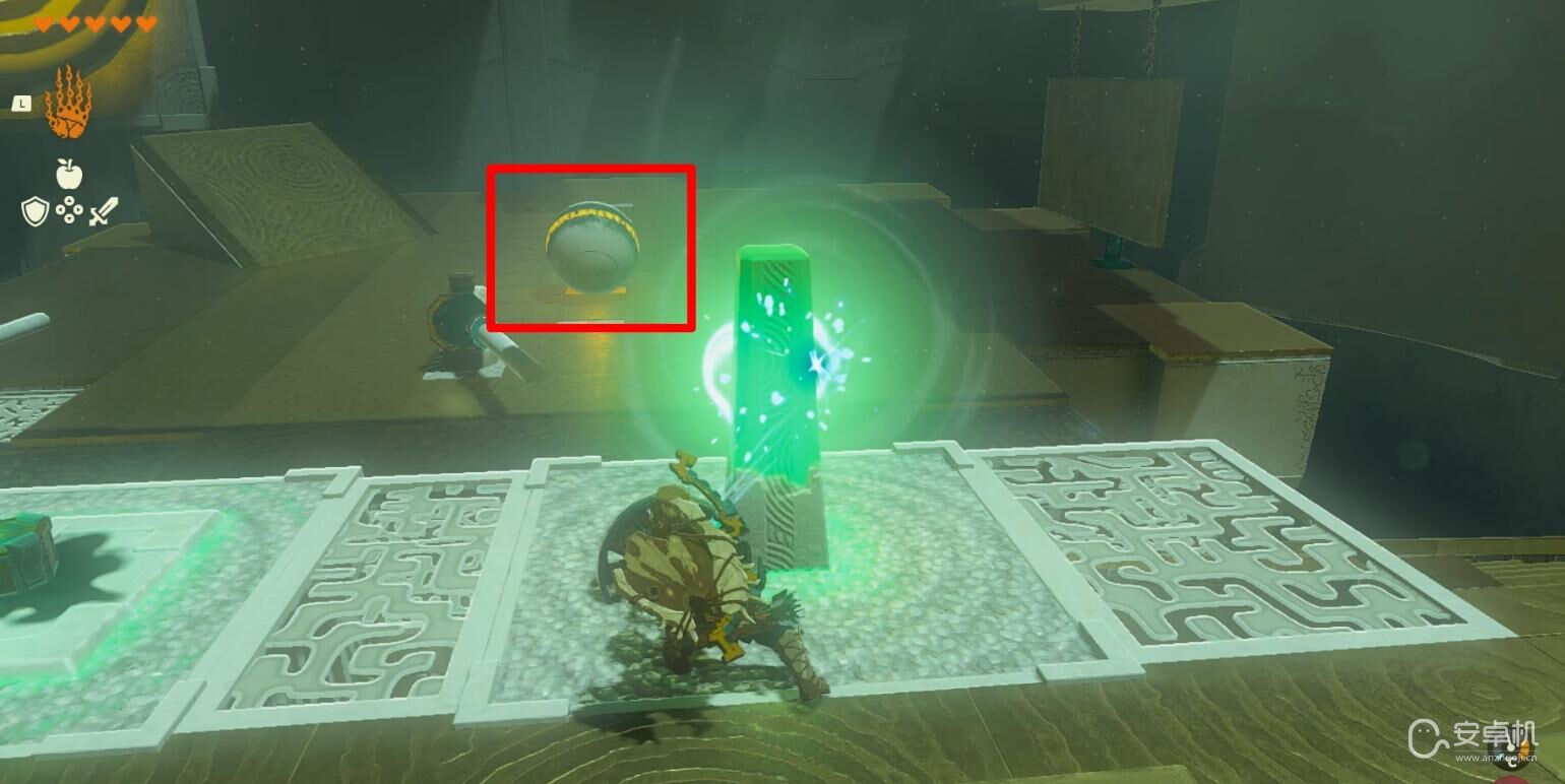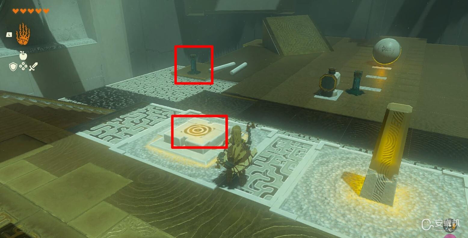 等石球移动至第一个灰色地砖的位置后敲打开关,让石球命中右侧的靶子。