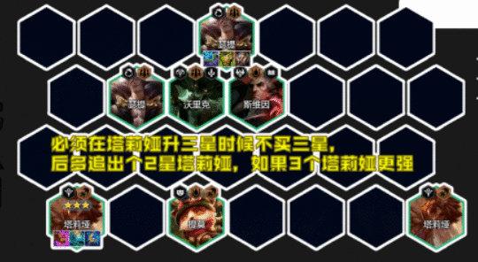 在塔莉娅能升三星时候不买最后一个棋子,进入对局后再买,这时候D卡能继续刷新出塔莉娅,后多追出个2星塔莉娅。后升7人口,再添加个瑟提就好。