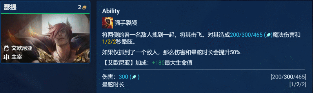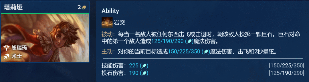 塔莉娅被连续削弱,主要就是强在其技能机制,被动技能只要敌方有棋子被击飞或击退的时候就能撇石头,造成魔法伤害,这也是今天这套阵容的核心思路。