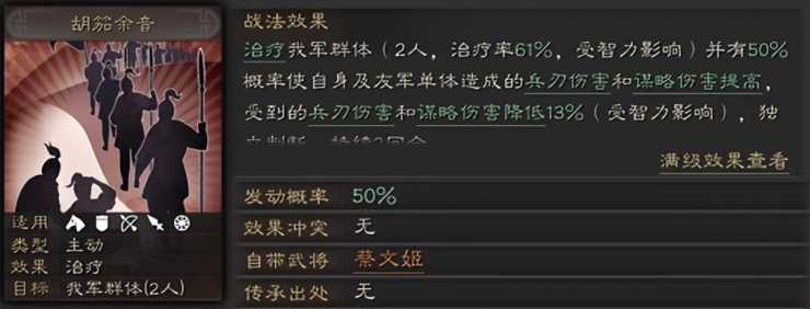 刮骨疗毒、杯蛇鬼车、暂避其锋、八门金锁阵、挫锐。蔡文姬自带的战法胡笳余音,是一款治疗型的战法,能够为我军两人进行治疗(受智力的影响,建议主加智力),胡笳余音不仅能够有治疗的效果还能使我军的兵刃伤害和谋略伤害的输出提高,所受伤害降低。