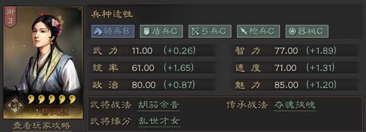蔡文姬,原名蔡琰,字文姬,陈留郡圉县人,东汉时期女性文学家。她的主要成就是首次创造五言体长篇自传叙事诗。而在《三国志战略版》这款游戏中蔡文姬是一名恢复型的辅助。我们可以看到蔡文姬的兵种属性是相当低的,但有一点值得提的就是蔡文姬所需要的统御值只要3,这在前期我们统御值低的时候我们就可以非常灵活的搭配统御值高的武将。其次蔡文姬的智力是比较不错的。