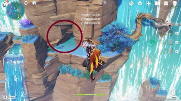 2、在瀑布中间部分有一棵歪歪的树,记住这个地标就行;