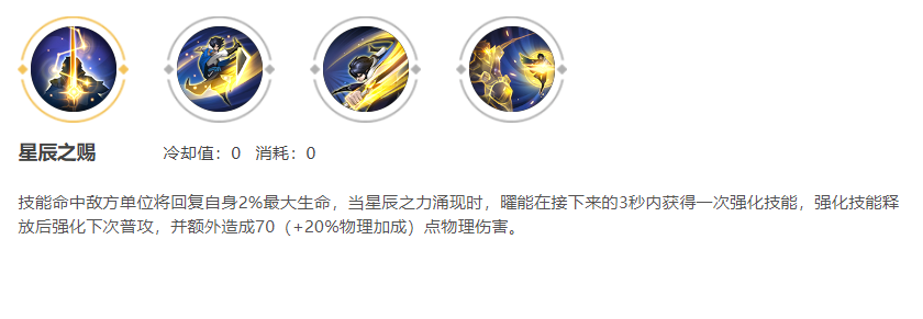 被动技能:每次释放技能可以叠一层类似能量的东西,最多可以叠三层,当叠满三层时,在接下来三秒内,普通攻击强化,强化后只要打到人就可以回一点点的血(最大生命值的百分之二),技能也会刷新冷却可以多放一次强化技能伤害是原技能的两倍,强化技能附带一定的额外效果。