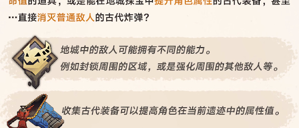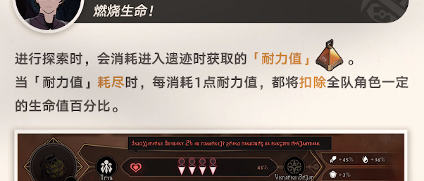 3、进行探索时,会消耗进入遗迹时获取的耐力值,当耐力值耗尽时,每消耗1点耐力值,都将扣除全队角色一定的生命值百分比;