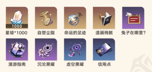 活动奖励星琼*1000、自塑尘脂、命运的足迹、遗器残骸、兔子在哪里、漫游指南、沉沦黑曜、虚空黑曜、信用点。