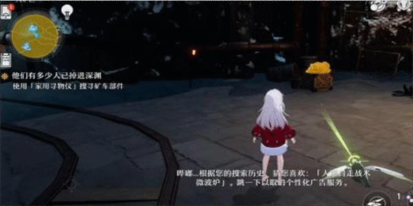 第一个矿车零件在地图有悬崖边上的宝箱的旁边,玩家可以通过R键获取方向的指示也可以打开地图寻找;
