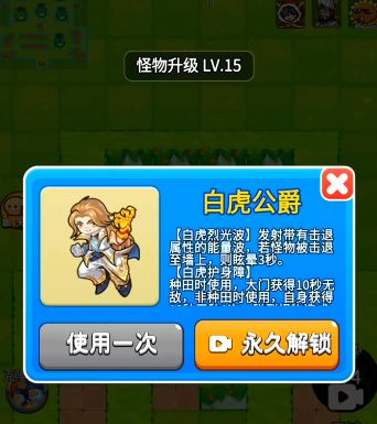 3、当角色升到15级得时候,就能自动解锁新隐藏皮肤【白虎公爵】,观看广告就i能永久解锁。