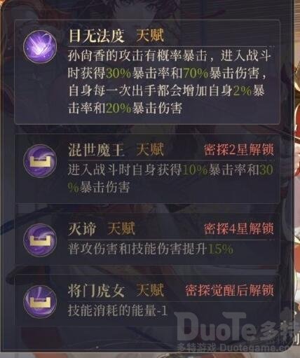 天赋:攻击有概率暴击,进入战斗时获得30%暴击率和70%暴击伤害,每一次出手增加自身2%暴击率和20%暴击伤害。