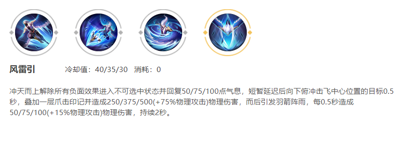 当能量气息满格时,云中君可展翅飞翔,自身将增加50点移速并能够免受地形阻挡。飞行模式下的云中君去攻击敌方英雄的时候,普通攻击就会转变成为爪子攻击,瓜子一是可以提高伤害性,二是只要触发被动,敌人在离开之后,自身还会不断受到被攻击效果出现。印记叠满五层后将被撕裂,身上则会散发金光,在此期间的5s内,目标单位每移动100码,将会受到一定物理伤害,该伤害会随着云中君等级提升而增加。云中君爪击有一定施法后摇,在近身输出时,通常利用走a来取消。云中君爪击撕裂效果与一技能还会对野怪与兵线造成额外伤害,清野带线能力十分优秀。