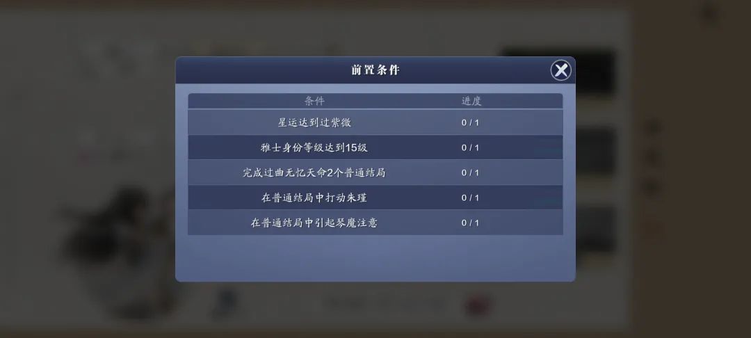 达成特殊结局也有一些前置条件:1、星运达到过紫微;2、雅士身份等级达到15级;3、完成过曲无忆天命2个普通结局;4、在普通结局中打动朱瑾;5、在普通结局中引起琴魔注意。