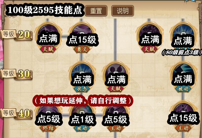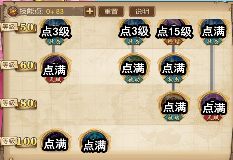为了保障分身,放弃了延伸技,主用的技能我们都点到了15级。其他技能的状态全都点满,【降无赖线】的状态也是80级前点3级,80级后点满。