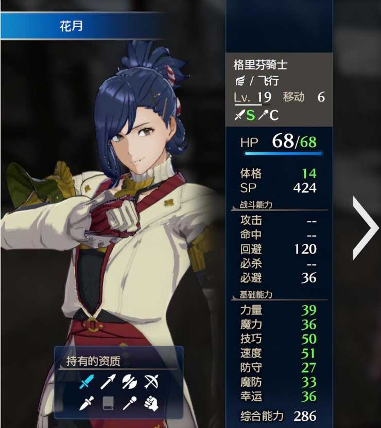 格里芬骑士在所有职业里,技巧和速度最为出色,搭配人物的速度技巧补正,可以说这是最适合花月的职业,打主线基本刀刀必杀,一个人可以抗下一支军队。
