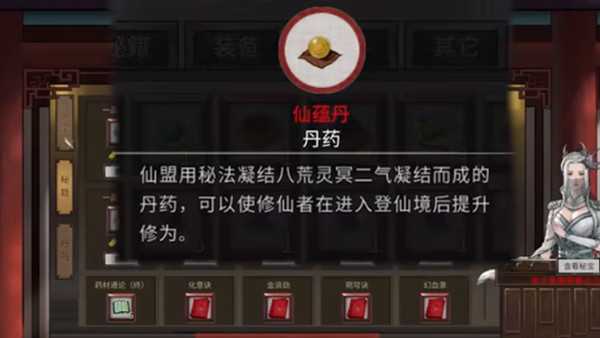 仙蕴丹:仙盟用秘法凝结八荒灵冥二气而成的丹药,可以使修仙者在进入登仙境后提升修为。