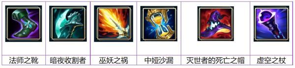 法师之靴+暗夜收割者+巫妖之祸+中娅沙漏+灭世者的死亡之帽+虚空之仗