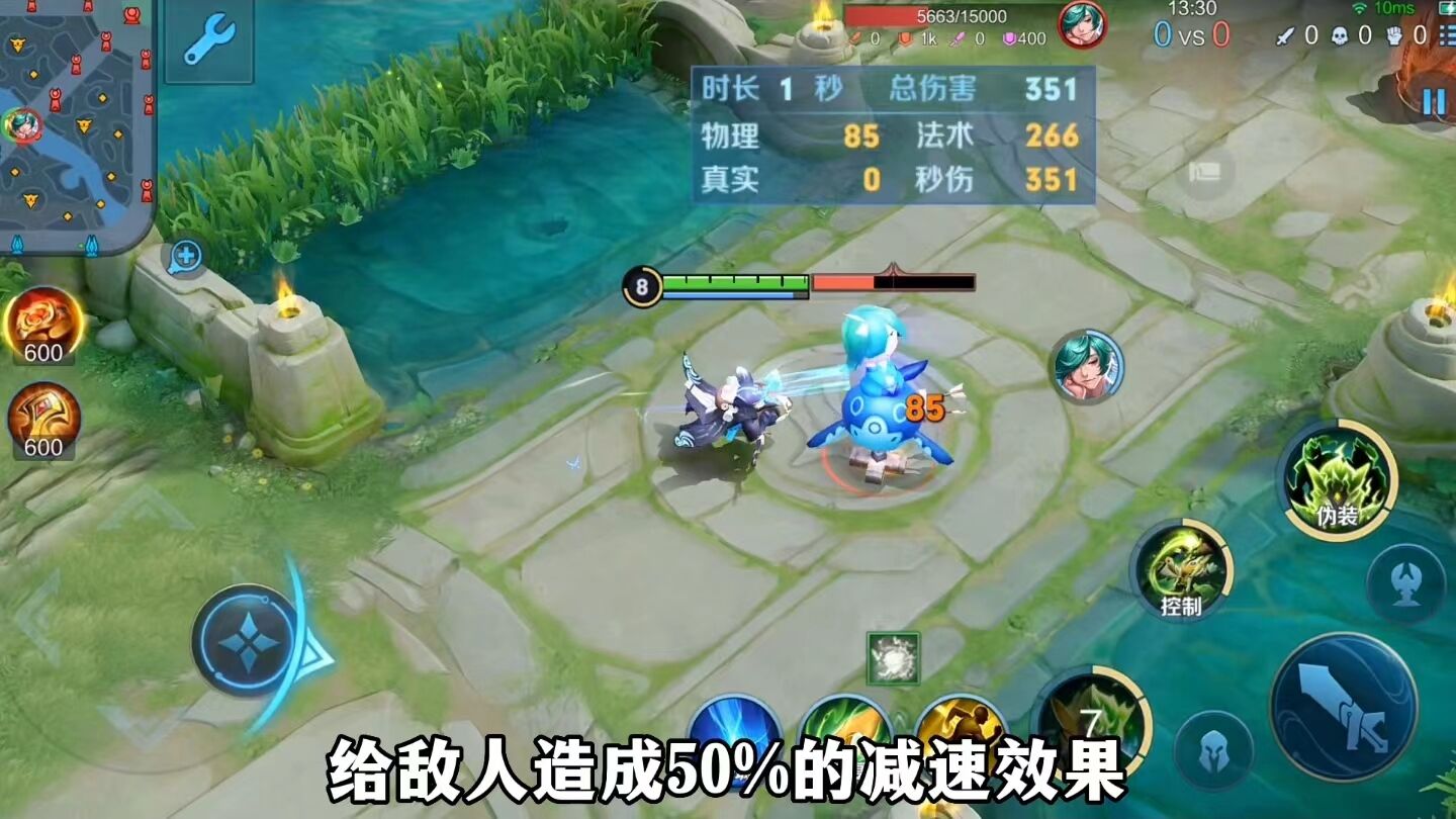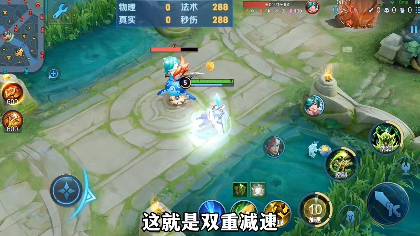 当我们一技能的伪装状态结束以后,刚好是三秒钟又可以获得一个强化普攻,这样我们就可以在短时间内打出两次被动强化普攻的减速效果,这就是双重减速,并且鬼谷子的强化普攻还是一个范围性的伤害以及范围性的减速效果。