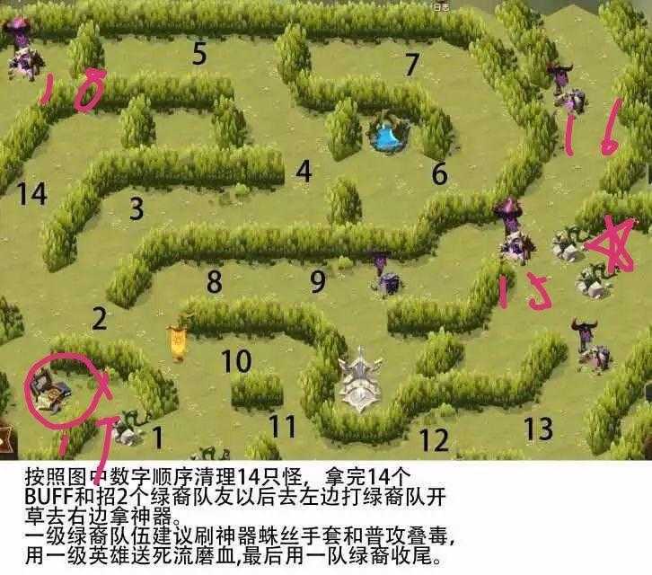 按照图中数字顺序清理14只怪可以获得14个buff和两个绿裔队友,然后去左边打绿裔队开草丛去拿神器。