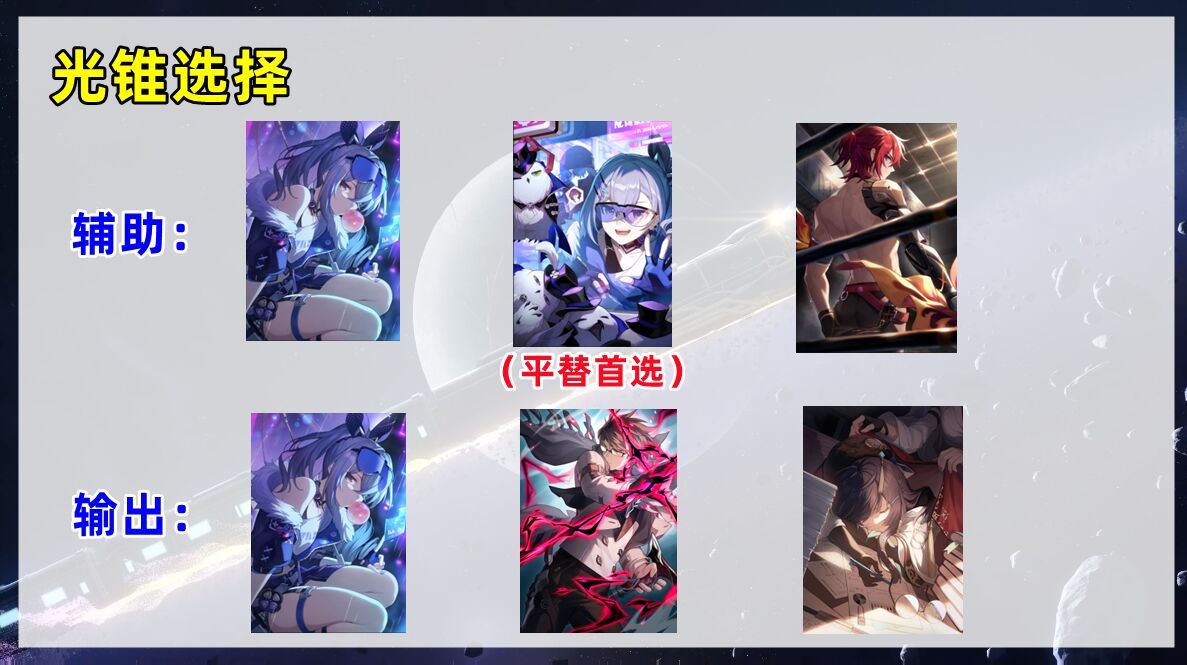 同样分辅助和输出两种路线,无论是哪种,首选都是专属光锥“雨一直下”。辅助路线方面,活动赠送光锥“新手任务开始前”为平替首选,其次是“决心如汗珠般闪耀”。输出路线替代可选“以世界之名”和“晚安与睡颜”。