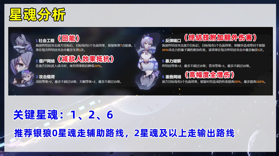 综合来看,星魂1、2、6是银狼的关键星魂,星魂6提升最为明显。0星魂的银狼更适合辅助,星魂2及以上走输出路线更优。