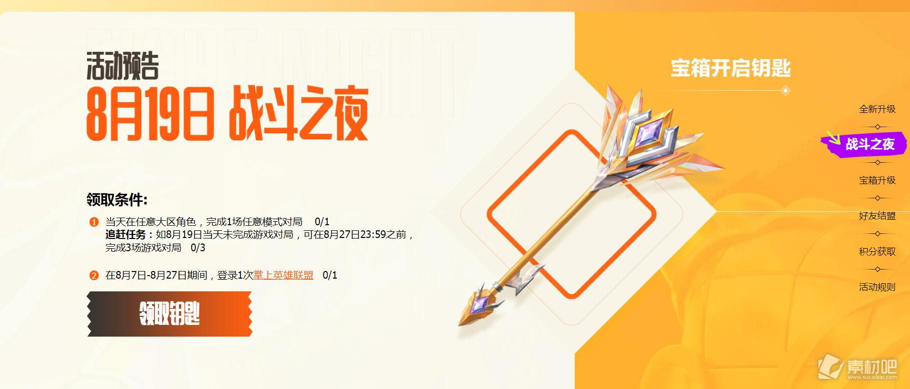 在活动期间同时完成以下两个任务,即可领取战斗之夜“宝箱钥匙”,用于解锁十二周年战斗之夜宝箱: