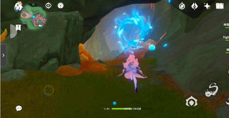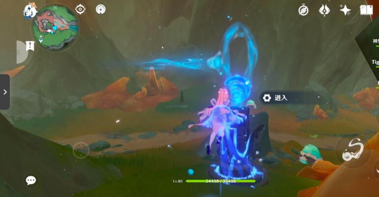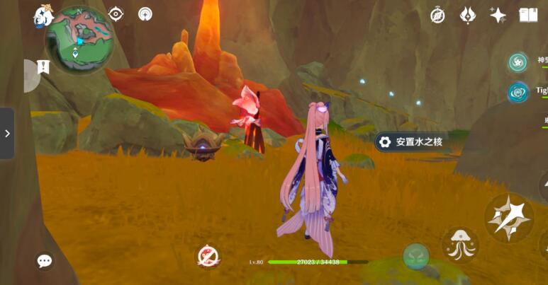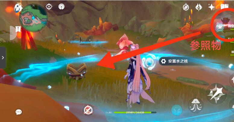 10、以上锁的元素方碑为参照物,从右边可以找到一个单独的水之核,角色在水元素附着的情况下可以使水之核成长为水环,将成为水环的水之核安置。