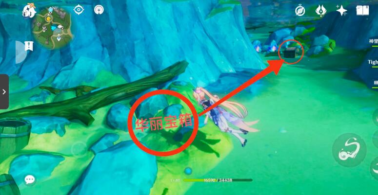16、派蒙会提示我们水温变正常,潜入水里获得一个华丽宝箱,在华丽宝箱的右侧,还有一个珍贵宝箱。