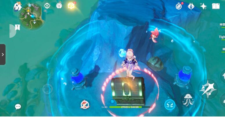 5、完成后游到宝箱附近,可以看到宝箱后面石头上有一个水之核触碰一下站在水里等待几秒钟可以点亮三个机关。