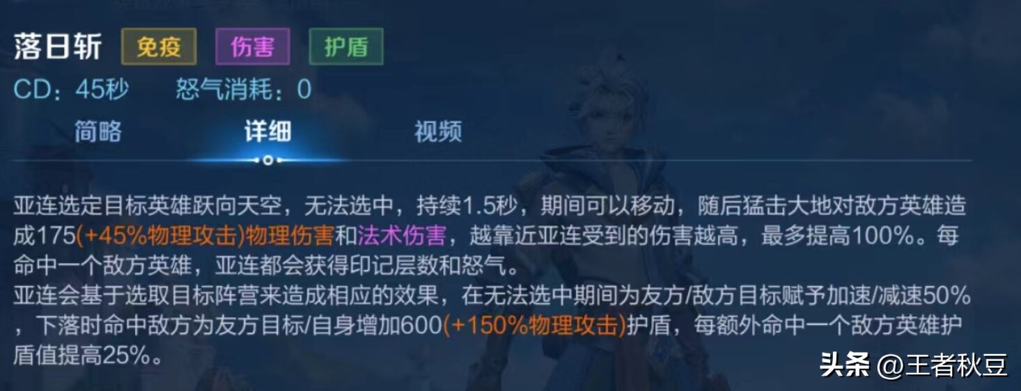 亚连大招类似云中君大招,飞跃空中并且无法选中,可以穿墙,落地造成物法伤,越中心伤害越高。每命中一个英雄获得印记和怒气,命中越多,印记和怒气叠加越多。