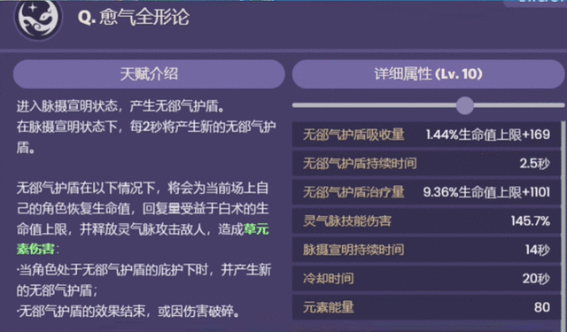 看下白术的固有天赋也是不错的,五运终天效果为队伍中前台角色生命低于50%时候,治疗白术自身20%血量,队伍中前台角色生命高于50%,白术获得25%草元素伤害加成,固有天赋在地为化,效果就是白术开大招,前台角色受到基于白术生命值上限不超过五万的部分,每1000点将使该角色触发燃烧、绽放、超绽放、烈绽放反应造成的伤害提升2%,超激化、蔓激化反应带来的伤害提升0.8%,持续六秒,两者最大值可提高100%和40%,还要个固有天赋在大世界中比较舒服,与部分采集物能为自己当前场上角色恢复生命。