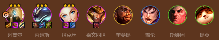 (1)阵容成员:阿兹尔、内瑟斯、拉克丝、嘉文四世、奎桑提、盖伦、斯维因、提莫
