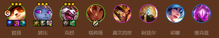 (1)阵容成员:提莫、波比、克烈、塔莉垭、嘉文四世、阿兹尔、娑娜、维克兹