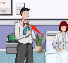 7、然后点击老婆手中【蓝色的布】、【水杯】、婴儿身上【红色的布】以及妹妹【脸上的表情】。