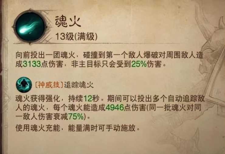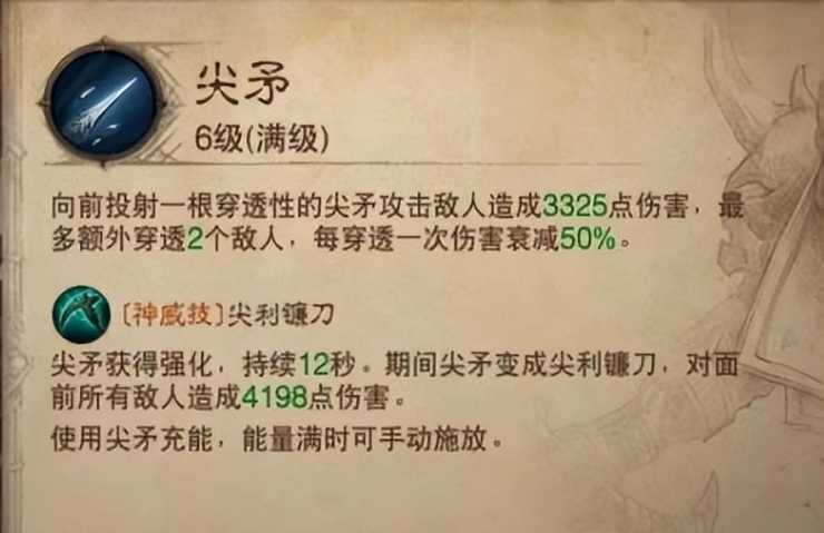 魂火: 击中目标会爆炸,而且对目标周围的敌人造成25%的伤害,属于小范围群伤技能。而且神威技能属于远程技能。对单个敌人的伤害比尖矛略微低一些。