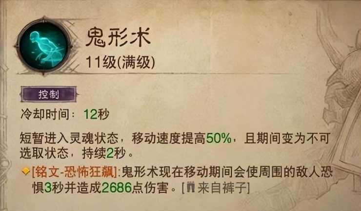 鬼行术+恐惧迫临(裤子):这个技能的优点于有很强的机动性,不论是赶路和野外抢怪都能先人一步外,既能从怪堆里突围,也能躲避各种致命伤。唯一的缺点就是没有伤害。