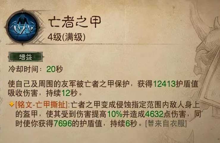 亡灵之甲:个人没怎么用过这技能,作为既能为友军减伤又能输出的技能,用的人也蛮多的。