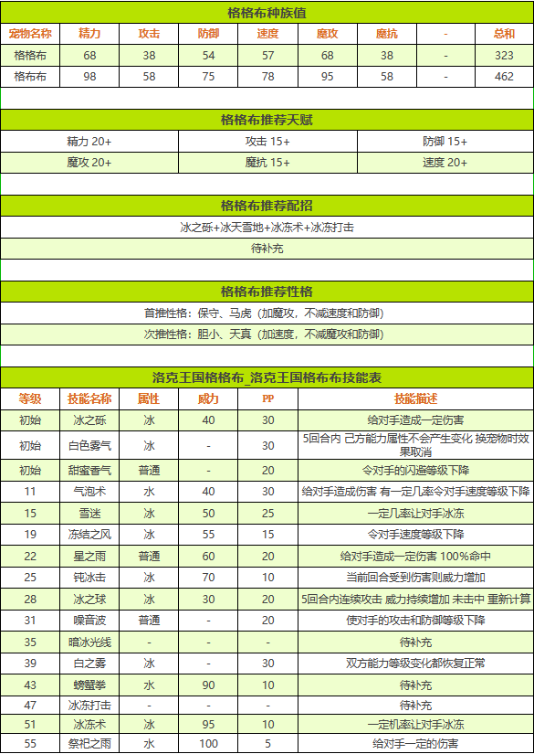 技能方面冰之砾是初始技能造成伤害,冰天雪地技能是通过探宝获得,是格格布不能缺少技能之一,冰冻术冰冻打击更加增加输出,还能够让对手冰冻。