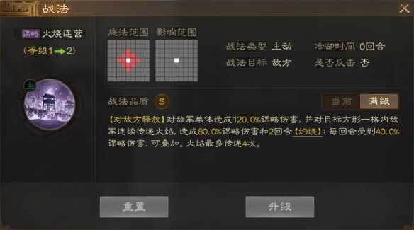 [释放给宿敌]交易120。对老敌人造成0%战略伤害,并持续向目标方格内的敌人传送火焰,造成80.0%战略伤害,2轮【燃烧】:每轮40.0%战略伤害。可以叠加。火焰最多传递4次。