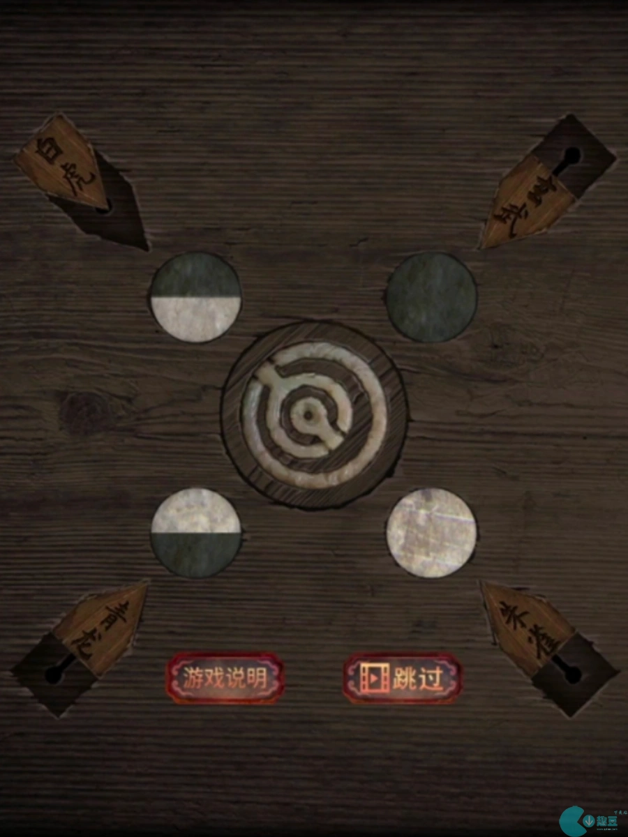 3、进入正厅,移开蒲团,放上黑白勾玉完成小游戏,打开密室,石碑和幡布上获得提示。在水缸洗净笔完成门前小游戏,打开木门,得到【木桶】、【卷轴】和线索。