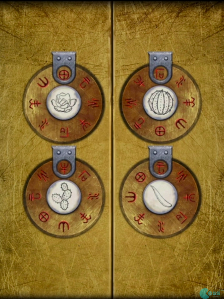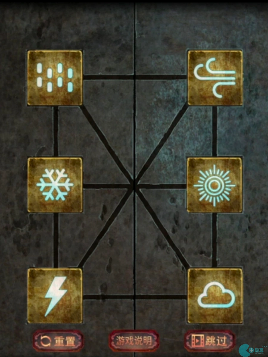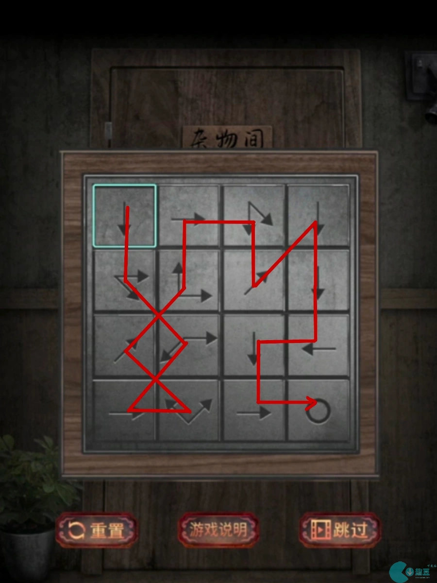 5、往下走到小庙左边的房间里,查看右下方的图纸,获得提示,根据提示磨好剪刀,往下走用剪刀剪开右边红色门上的麻绳