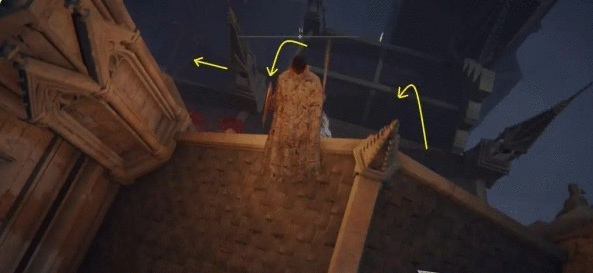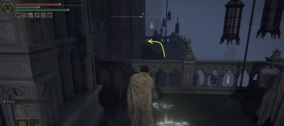 5、然后我们跳到下方的屋顶后向右前方走,可以看到一座塔楼。