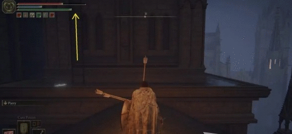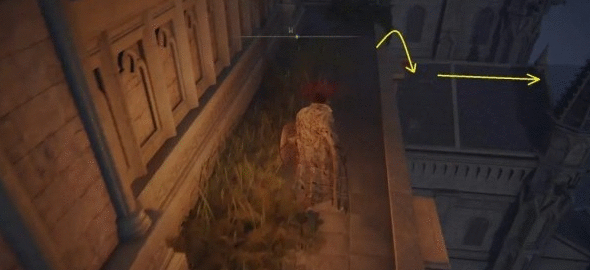 11、沿着屋檐一路向前,在如图所示的位置跳到对面,通过坏掉的窗户进入里面。