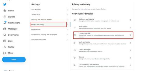 3、在“设置Settings”中找到“隐私和安全 Privacy and safety”右侧“你看到的内容 Content you see”。