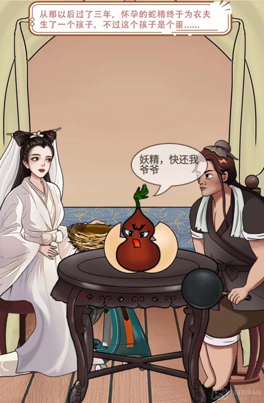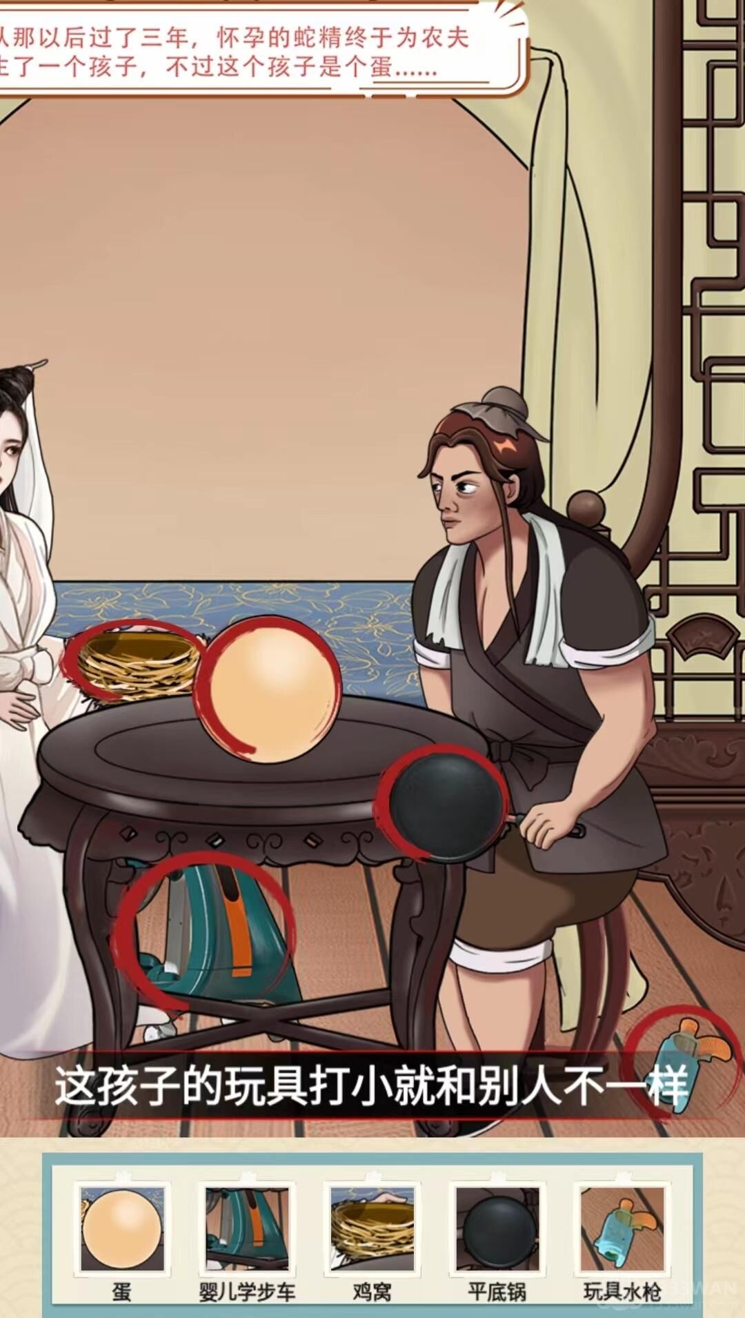3、点击奇怪的蛋,桌下能看到的婴儿学步车,白蛇手上的鸡窝,农夫手上的平底锅,右边地面上的玩具水枪。