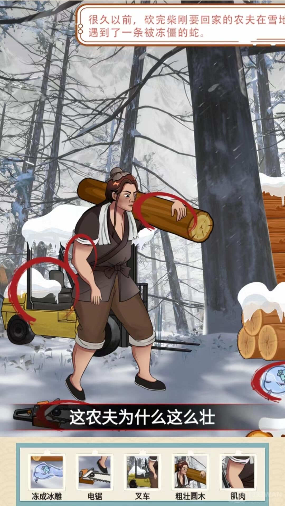 1、首先我们将人物拖动到正确的位置,点击冻成冰雕的蛇,农夫脚边的电锯,后面的叉车,农夫扛着的圆木,农夫露出的结实臂膀,再把蛇拖动到柴上。