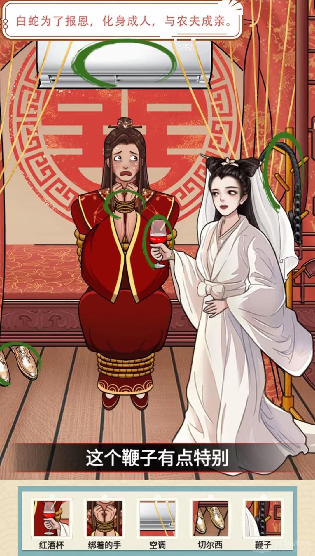 2、接下来白蛇报恩,点击白蛇手上的红酒杯,农夫绑着的手,床后面的空调,左边帘子下的切尔西,右边架子上的鞭子。