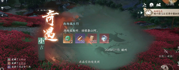 冉冉孤生竹是一个小吉的奇遇任务,玩家可以根据上面的步骤进行操作就可以完成本次的任务了,玩家在寻找花笺的时候可以根据位置来找,在一个大树的下面,具体的坐标就是【685,633】,找到之后提交就完成任务了。